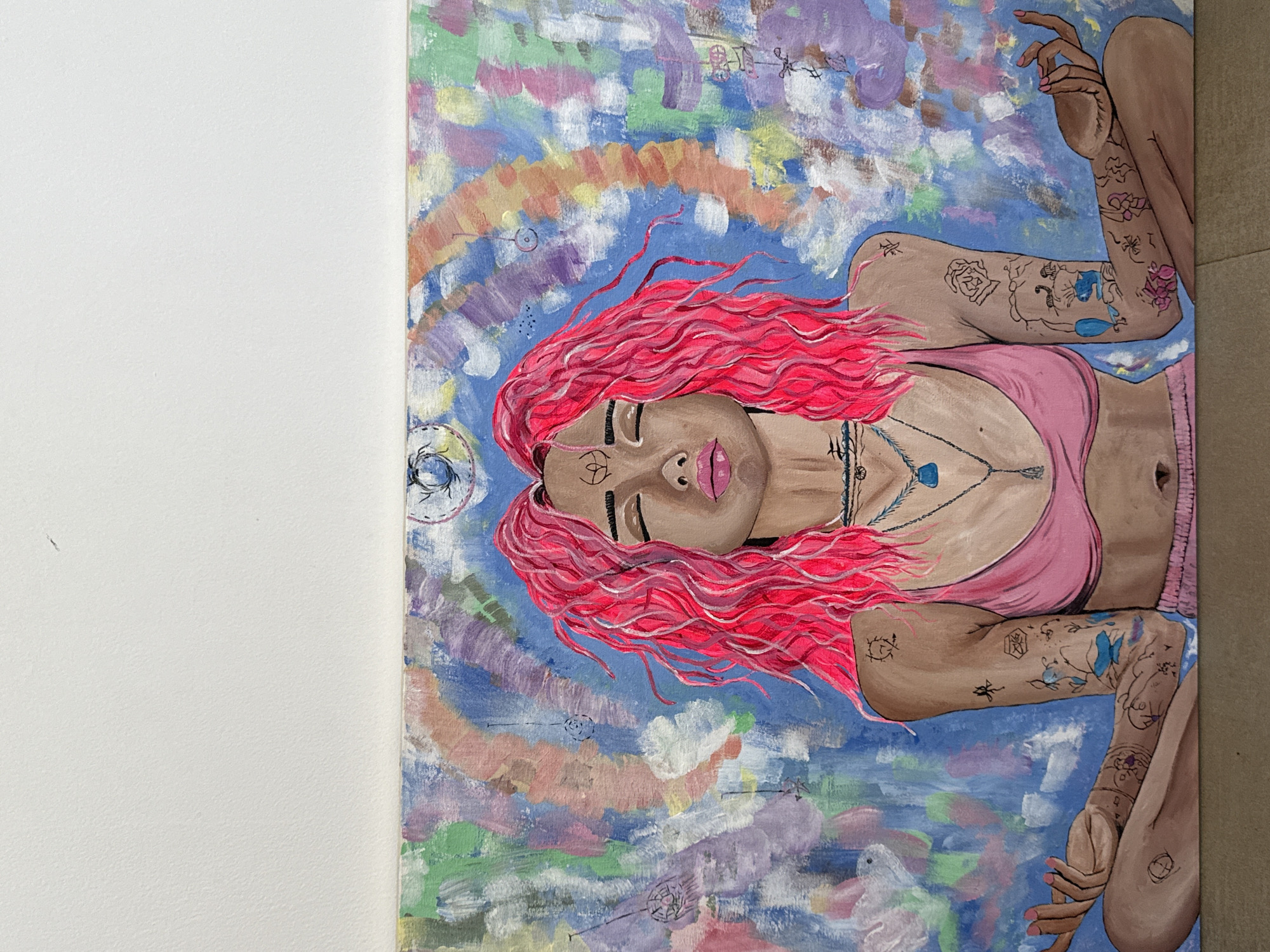 A medium, angled, close-up shot features a painting inside a sketchbook. The painting displays a woman with bright pink hair, lying on her back with eyes closed. She has tattoos on her arms and chest, and is wearing a pink tank top. The background of the painting is a swirl of pastel colors, predominantly blue, purple, green, and peach. Small, geometric symbols are scattered throughout the background. The sketchbook is open, with the painting occupying the right page, and the left page is blank white. The location is not discernible from the image.