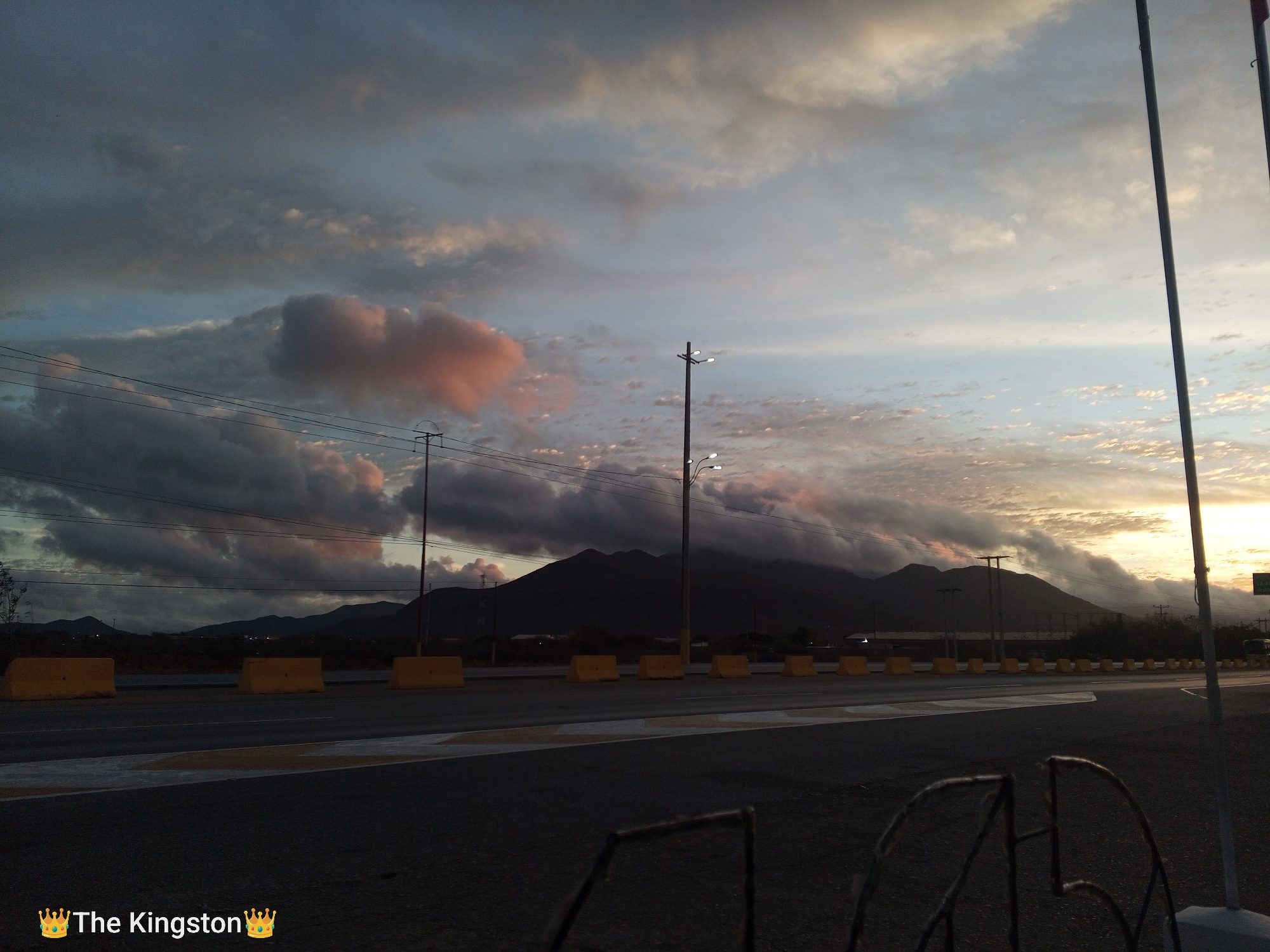 The image depicts a landscape at dusk in what appears to be a semi-urban or suburban area. In the background, there are dark mountains partially obscured by low-lying clouds. The sky above exhibits a mix of dark and light clouds, some tinted with a pinkish hue. A highway bisects the foreground, with yellow concrete barriers lining the shoulder. Utility poles and streetlights are visible along the roadside. The lighting suggests either a sunrise or sunset. The location is identified in the image as El Dátil, Venezuela. The scene is devoid of people or moving vehicles. A partially visible wrought iron structure is present in the immediate foreground.