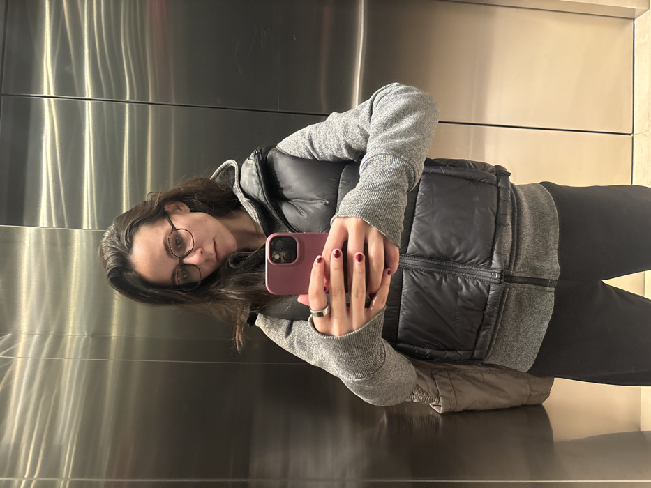 A woman with glasses takes a selfie in a mirrored space, possibly an elevator. She wears a grey sweater with a black padded vest, dark pants, and a ring. Her nails are painted a dark color. The reflection shows panels or sections of a reflective material behind her. She holds a mauve-colored smartphone in her hands, its camera facing her.