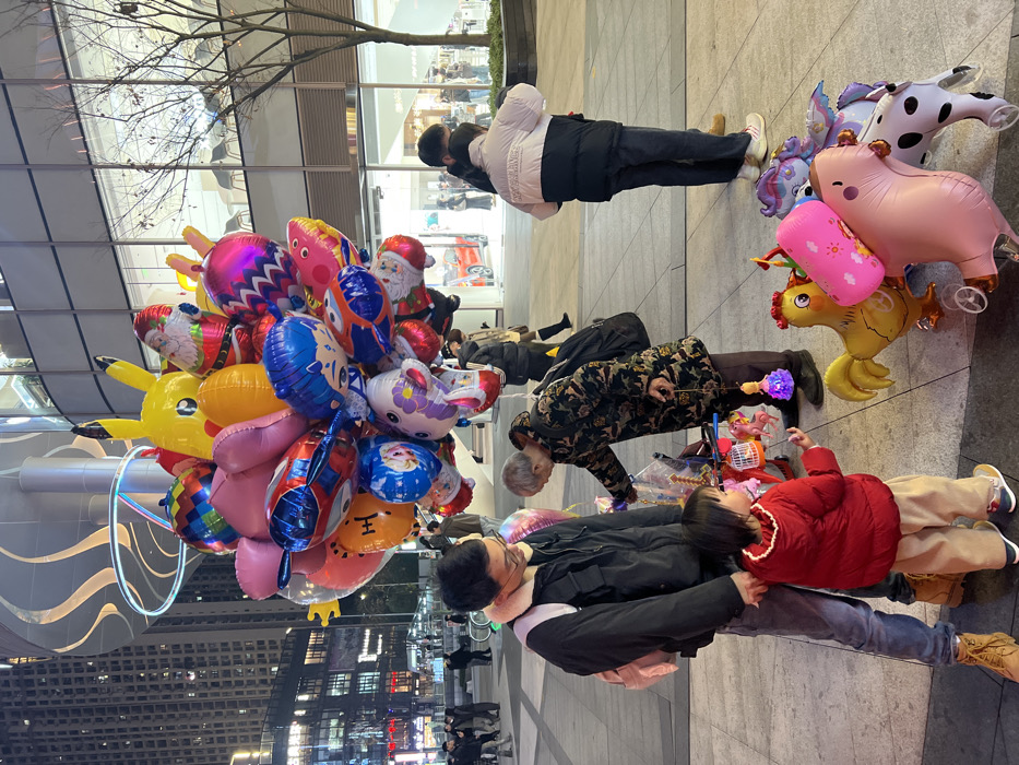 The image depicts an urban pedestrian area at night in Liangjiang, China. In the foreground, an elderly male vendor, dressed in a camouflage jacket, stands holding a large cluster of inflated foil balloons, which include various characters such as a yellow Pikachu, Santa Claus, an airplane, and generic animals. Adjacent to him on the ground, several smaller, wheeled foil balloons, shaped like a yellow chicken, a pink pig, a unicorn, and a spotted dog, are displayed. An adult male, wearing a dark jacket and glasses, with a pink backpack, stands to the left of the vendor, observing the items. A young child, dressed in a red jacket and tan pants, stands between the adult male and the vendor, pointing towards small, illuminated lanterns and toys on the vendor's portable display. In the mid-ground and background, multiple pedestrians are visible walking on a paved plaza. Modern, multi-story buildings with extensive glass facades and internal lighting frame the scene. A bare-branched tree stands near one of the buildings. A red vehicle is visible through a large glass display window in a building on the right. The area is illuminated by artificial light sources from the surrounding buildings and overhead fixtures.