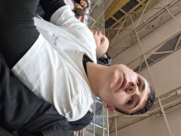The scene is set within the spectator area of Arena Asarel, Panagyurishte, Bulgaria. A young male, approximately 18-25 years old, with short dark hair, occupies the foreground, looking upwards and to the viewer's left. He wears a light-colored, short-sleeved t-shirt over a black long-sleeved shirt. His left arm is visible in the lower left quadrant. Immediately behind and to the left of the primary subject, a second young male with short, dark hair is partially visible, also looking upwards. Further back, two females are present; one with dark hair smiles towards the camera, while the other is mostly obscured. The background features the structural elements of an indoor sports arena, including a high ceiling with extensive white metal trusswork and overhead lighting fixtures. Elevated seating sections, characterized by orange-colored elements and yellow wall panels, are visible in the upper mid-ground. The lighting is bright and even, consistent with an indoor facility. The individuals appear to be observing an event occurring within the arena.