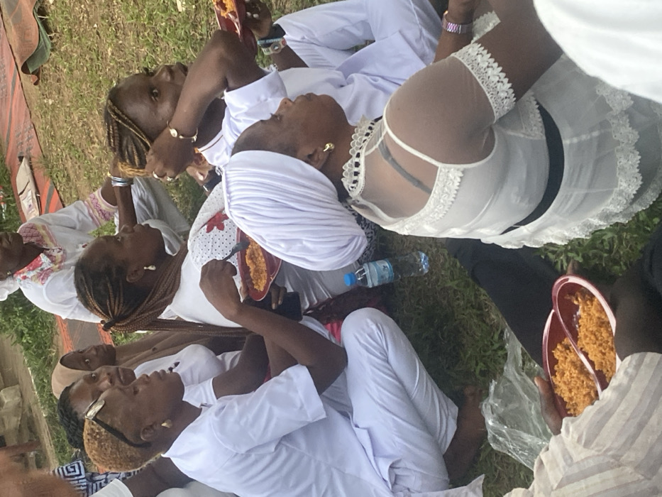 A group of African women, mostly in white, are seated outdoors. Many are eating from red plastic plates. The attire ranges from traditional white wraps to modern white lace tops. Some women have braided hair, others wear headscarves. A water bottle is visible amongst them. The scene appears to be a casual gathering, possibly a celebration or religious event.