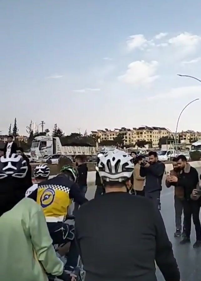 group of people on bicycles gathered on a street, seemingly in a protest or demonstration. Many of them are wearing helmets. Some people are holding up their phones, apparently taking pictures or videos. Some individuals are wearing black clothing with green accents. A Syrian flag is briefly visible. The backdrop features buildings and streetlights. A vehicle is visible in the background. The overall impression is of a political gathering or demonstration.