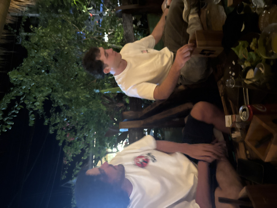 The image depicts two males seated at a low table in an outdoor or semi-outdoor setting at night in Uluwatu, Indonesia