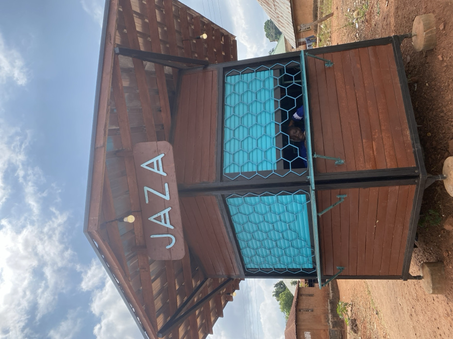 The scene depicts a small, freestanding kiosk-style structure located in Ameka, Nigeria. The kiosk is constructed from reddish-brown horizontal wood paneling, features a black metal support frame, and is topped with a sloped corrugated metal roof. A wooden sign reading "JAZA" in light blue block letters is affixed to the front facade below the roofline. Two exposed incandescent light bulbs hang from the underside of the roof structure. The front of the kiosk features two open sections at counter height, each fitted with a light blue hexagonal lattice screen. Behind the right screen, light blue blinds are visible, and a young individual, likely a female, with dark hair and wearing a blue garment, is seen smiling and peering out. The kiosk is elevated approximately 0.5 meters from the ground by black metal legs resting on small concrete blocks. The surrounding environment consists of reddish-brown soil. In the background, to the left, a traditional-style building constructed from reddish-brown earth with a corrugated metal roof is visible. To the right, another building with a green roof is partially visible. The sky is partially cloudy with visible blue patches.