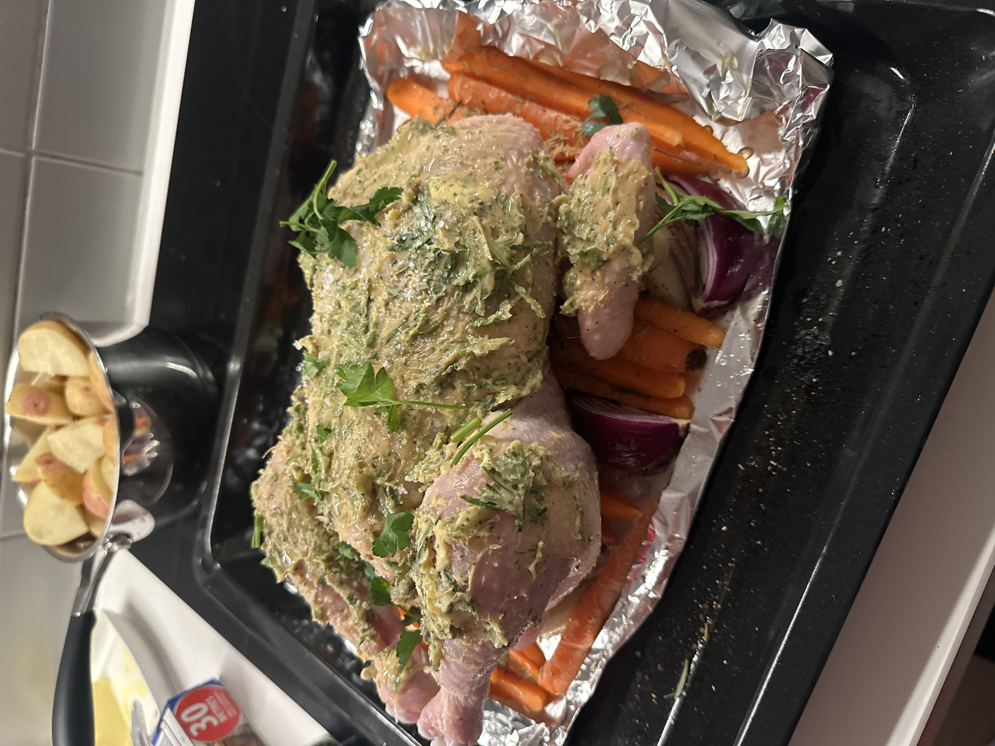 - "A raw chicken covered in a green herb rub is sitting on a roasting pan lined with aluminum foil" by FM-hLwGm2, licensed under CC BY 4.0