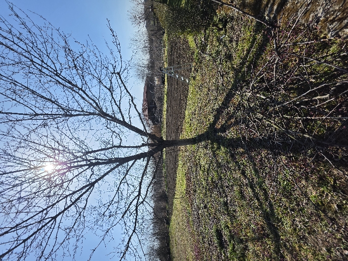 The image depicts an outdoor scene in Lubenova Mahala, Bulgaria, under a clear blue sky and direct sunlight. A leafless deciduous tree stands centrally, its dark, intricate branches silhouetted against the sun, which is positioned high behind the tree and creates a starburst lens flare. The tree casts a prominent shadow extending into the foreground. The ground immediately surrounding the tree and in the foreground is covered with sparse green and reddish-brown vegetation, interspersed with patches of bare earth. A significant accumulation of freshly cut, dark tree branches lies on the ground, primarily at the base of the central tree and extending towards the lower right. Further into the midground, to the right of the central tree, the ground appears to be tilled soil. In the background, a building with a reddish-brown tiled roof and dark walls is partially visible, obscured by dormant vegetation. A light-colored A-frame ladder stands upright in the mid-distance to the right of the building. No individuals are present in the scene.