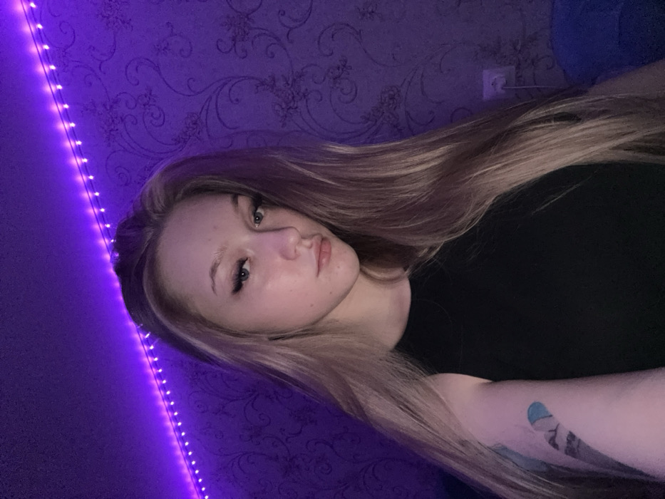 The scene is an indoor setting in Saratov, Russia. A young female is positioned centrally, looking directly at the viewer. She has long, straight, blonde hair with darker roots, parted slightly off-center. Her eyes are light-colored, and she has visible dark eyeliner with extended wings and voluminous eyelashes. She wears a black sleeveless top. On her left upper arm, a tattoo is visible, consisting of a light blue abstract shape (resembling a crescent or cloud) superimposed over a grayscale image, possibly depicting mountains or abstract elements. The background wall is covered with dark wallpaper featuring a lighter, intricate floral or damask pattern. A string of purple LED lights runs horizontally across the upper portion of the wall, providing the primary illumination and casting a purple hue over the scene. In the lower right background, a white electrical outlet is visible with a white plug inserted into it. A dark blue fabric or object is partially visible in the bottom right corner. No other individuals or significant objects are present in the visible frame. The female is the sole subject and action involves posing for the photograph.