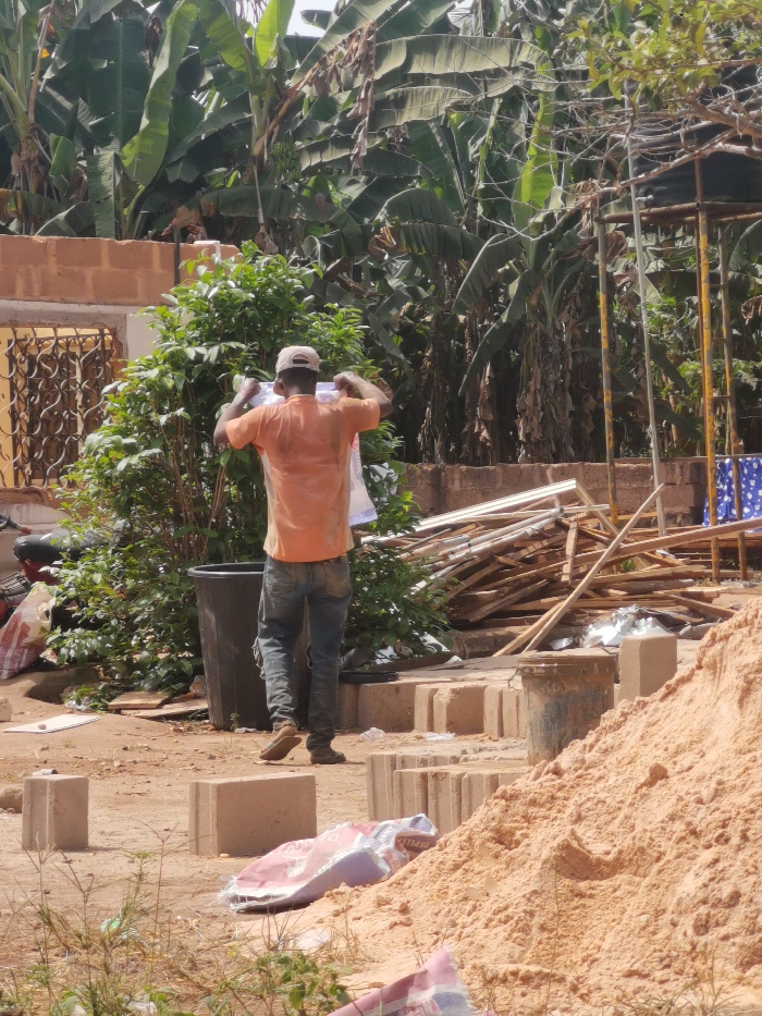 In Ani-Ugbo, Nigeria, an outdoor scene depicts a male individual, viewed from behind, standing on unpaved dirt ground. He wears an orange short-sleeved shirt, dirty blue jeans, and a light-colored cap, holding a white plastic bag or garment overhead with both hands. The foreground features a large pile of light brown sand on the right, with several light-colored concrete blocks and a discarded reddish-purple and white patterned bag on the left. Scattered green weeds are present at the bottom edge. In the mid-ground, a dark cylindrical bin and a dense green leafy bush are situated to the subject's left. Further left, a light-brown brick wall with a decorative metal security grille and a partially visible dark motorcycle are present. To the subject's right, a substantial pile of wooden planks and debris is visible. More concrete blocks are neatly stacked behind the sand pile, and a rusty metal bucket rests nearby. A rudimentary metal frame structure draped with blue and white patterned fabric is located further to the right. The background is dominated by numerous tall, green banana or plantain trees, some bearing fruit, extending behind a low brick wall. The scene is brightly illuminated, indicating daylight.