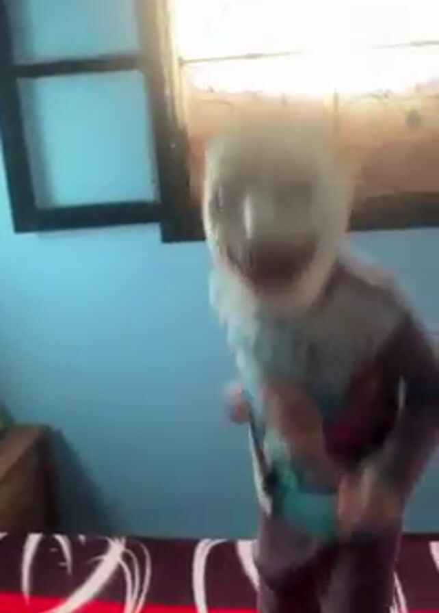 - "A child wearing a Frozen t-shirt, maroon pants, and a creepy white mask is jumping up and down on a bed" by FM-PJNzU2, licensed under CC BY 4.0