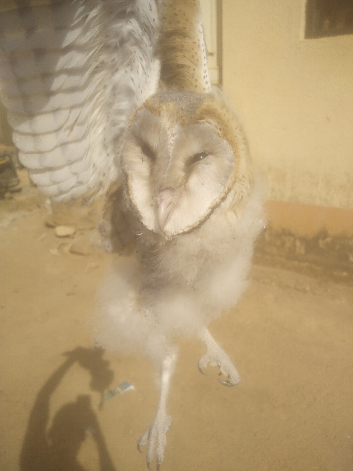 The image captures a juvenile Barn Owl (Tyto alba) in a dynamic, upright position outdoors in Jos, Nigeria
