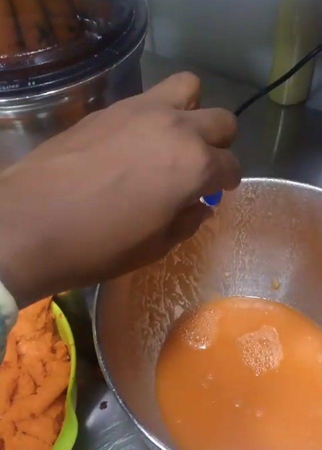 A close-up video shows a hand using an electric juicer to extract juice from carrots. The hand holds the juicer over a stainless-steel bowl containing orange juice, which is likely the extracted juice from earlier carrots. Next to the bowl is a green container filled with carrot pulp. The scene is set on a stainless-steel countertop, with other kitchen items and appliances visible in the background. The hand pours the fresh carrot juice into the bowl.