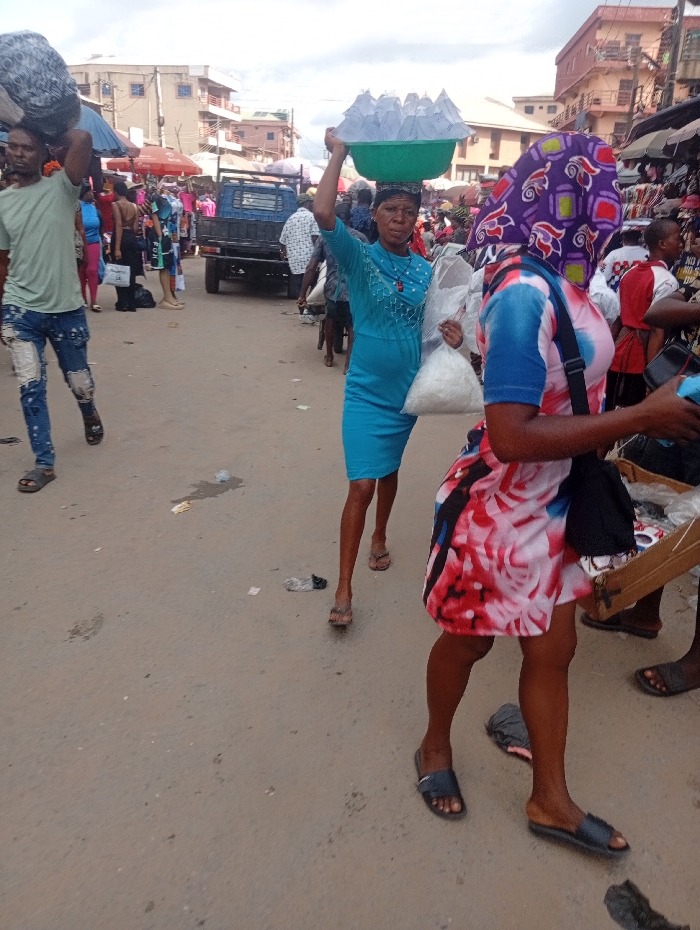 The image captures a busy street market scene in Fegge, Nigeria, under natural daylight with an overcast sky. The ground is an asphalt road with scattered litter and dirt patches. In the immediate foreground, right, a person is visible from the chest down, wearing a multi-colored floral pattern dress (red, white, blue) and a purple, patterned head wrap. They wear black slip-on sandals and hold a black bag and a wooden tray. Centrally in the mid-ground, a woman in a turquoise blue short-sleeved dress and light brown sandals walks towards the viewer's left. She balances a green plastic basin on her head, which contains numerous clear plastic sachets of water. Her left hand holds a large clear plastic bag filled with white granular material. Her gaze is directed slightly to the left. To the mid-ground left, a man in a light green t-shirt, distressed blue jeans, and dark sandals walks towards the viewer's left. He carries a large, bundled, patterned object on his left shoulder/head. The background reveals a crowded urban environment. A dark blue utility truck is visible. Numerous other individuals are present, some beneath market awnings, indicating active pedestrian and commercial traffic. Multi-story buildings with various facades, including red-brown and lighter tones, line the street.