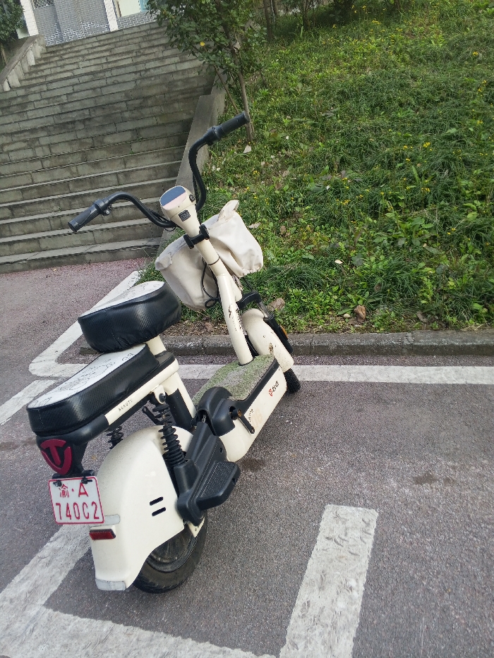 - "An unoccupied, cream-colored electric scooter with black seats and handlebars is parked on an asphalt surface in Jiangjin, Chongqing, China" by FM-oJvmO2, licensed under CC BY 4.0