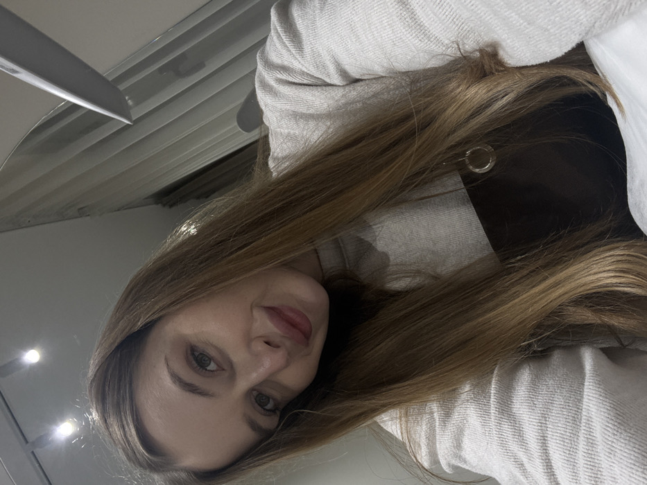 A young adult female is depicted in a close-up, chest-up selfie, located in Budva, Montenegro. She possesses long, light brown hair extending over her shoulders, parted near the center. Her facial features include light-colored eyes and a subtle smile with closed lips, suggesting a pleasant expression. She is wearing a light-colored, possibly beige or grey, ribbed long-sleeved top, with a darker garment visible underneath. A simple, silver-toned circular pendant hangs from a chain around her neck, resting on her chest. The background is an indistinct indoor setting with two illuminated recessed spotlights visible on a light-colored ceiling. To the upper right, a portion of a diagonal white object or structure is visible. Vertical lines, possibly from a window blind or architectural feature, are present on the right side of the background. The lighting is artificial, illuminating the subject from above.