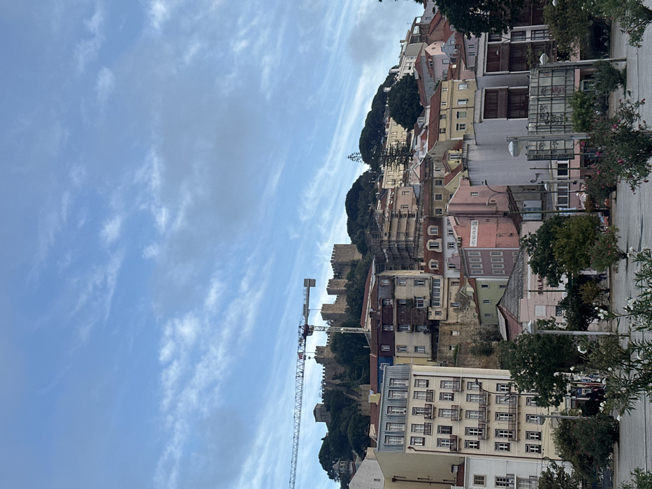 This image captures a panoramic view of Lisbon, Portugal, specifically looking towards the Castelo de São Jorge (São Jorge Castle) from a lower elevation, likely from an area near the Baixa or Alfama districts. In the upper third of the frame, the Castelo de São Jorge stands prominently atop a densely wooded hill. Its ancient fortified walls and battlements are clearly visible. A large, grey construction crane with a red section is positioned in the mid-ground, its boom extending horizontally across the cityscape, partially obscuring the lower castle walls and suggesting ongoing urban development. Below the castle, numerous multi-story residential and commercial buildings cascade down the hillside. These structures display a variety of architectural styles and pastel color palettes, including cream, yellow, pink, and white facades. Many buildings feature multiple windows and balconies, with red-tiled roofs common. Scaffolding is visible on at least one building on the middle left slope, indicating renovation or construction. The foreground consists of a paved urban square or plaza with scattered green shrubs and small trees, some bearing white and pink blossoms. Several lampposts are present within this area. Indistinct human figures are minimally visible in the background portion of the square, their specific actions unidentifiable. The sky above is blue with scattered, wispy white and grey clouds.