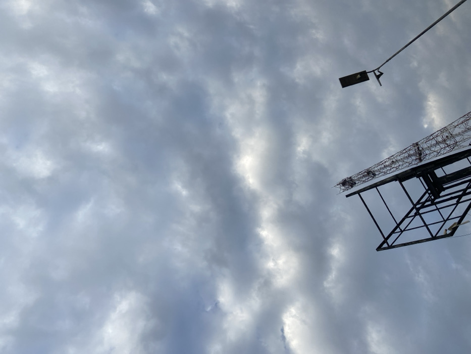 A low-angle shot of a cloudy sky. The clouds are varied in tone, ranging from light gray to dark. Obscuring the sky are structural metal frameworks, including what appears to be the upper portion of a billboard and a streetlamp mounted on a pole. The billboard frame has a latticework-like upper section. The streetlamp is angular and modern. The image's overall mood is somewhat gloomy due to the overcast sky and stark man-made structures.