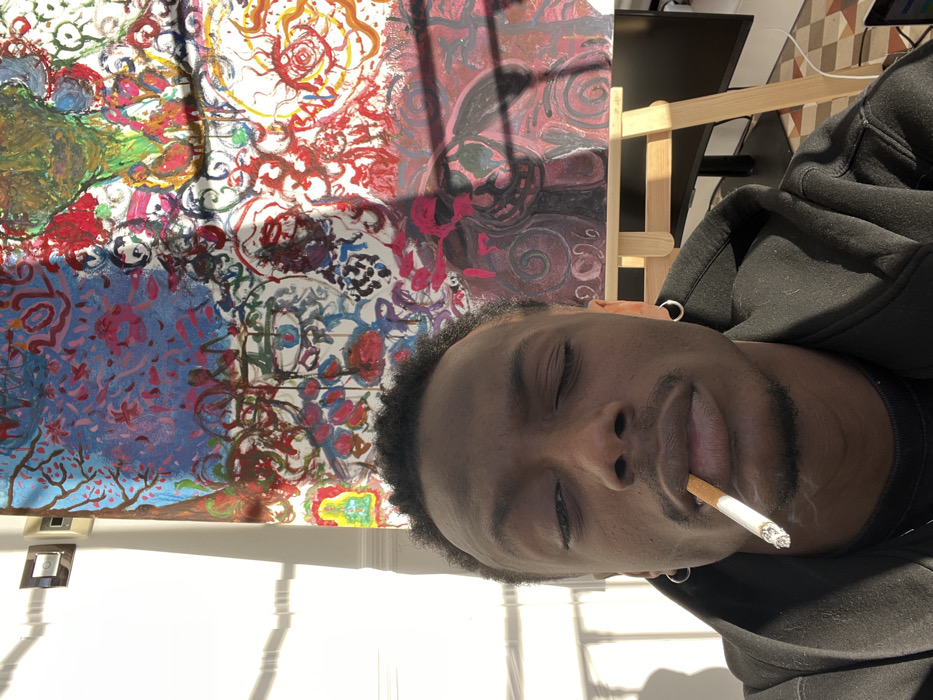 A dark-skinned male, approximately 20-35 years old, is prominently featured in a close-up photograph, presenting a direct gaze with his eyes closed or nearly closed. He has short dark hair, a mustache, and a goatee, and wears small silver hoop earrings in both ears. A lit cigarette, emitting visible smoke, is held between his lips. He is clad in a dark, hooded garment. The background is dominated by a large, vibrantly colored abstract painting mounted on a wooden easel. The artwork features a complex interplay of blues, reds, greens, yellows, and black, with organic shapes, swirls, and stylized elements, including a yellow Buddha-like figure on the left and the partial text "BARA" in yellow, indicative of Barcelona, Spain. The year "2021" is also visible in the upper left portion of the painting. Strong natural light enters from the left, casting distinct horizontal shadows on a white wall to the left of the painting and a diagonal shadow across the artwork itself. A light switch or electrical outlet is affixed to the white wall. Below the painting, two dark computer monitors and a partially visible laptop are positioned on a surface, suggesting a workspace. The floor in the lower right displays patterned tiles.