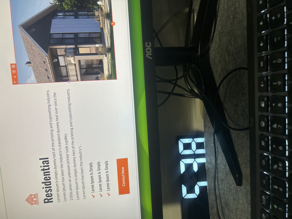The scene is located in Voluyak, Bulgaria. An AOC computer monitor occupies the upper frame, displaying a webpage. The left portion of the screen features "Residential" text with a house icon, followed by "Lorem Ipsum" placeholder text and a red "Contact Now" button. The right portion shows a digital rendering of a modern, two-story house with a brown gabled roof, dark grey upper facade, light-colored lower sections, large windows, and a balcony. A white mouse cursor is positioned over the house image. Below the monitor, a digital clock displays "5:38" with glowing blue-white numerals. Multiple black cables are tangled behind the monitor's black stand. The immediate surface is covered by a grey felt material. A partially visible black Logitech keyboard with illuminated keys is in the foreground. No individuals are present.
