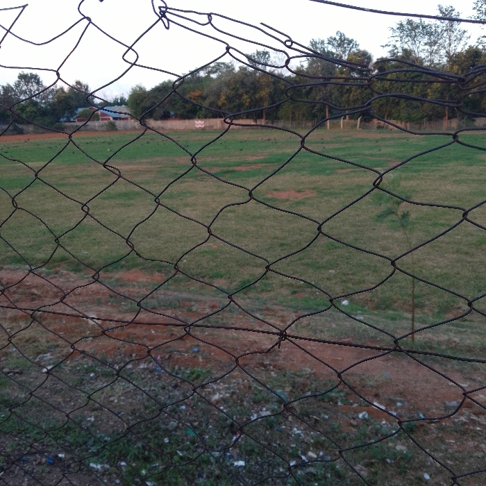 The image presents an outdoor scene in Wote, Kenya, viewed through a dark, weathered chain-link fence that occupies the majority of the foreground. The fence, constructed of woven wire forming diamond-shaped apertures, exhibits signs of wear, including bent and broken wires along its top edge. Immediately beneath the fence line, a narrow strip of ground shows sparse green vegetation amidst reddish-brown soil, with scattered small debris visible. Beyond the fence, a large, open field extends into the midground and background. This field is characterized by a mix of green grass and significant patches of exposed reddish-brown earth, indicating an unmaintained or heavily utilized surface. No specific markings, goals, or other equipment are visible within the field to denote a formal playing area. In the distant background, a line of mature trees forms a boundary. Partially visible through and above these trees are the roofs of several low-rise structures, colored blue and red, suggesting residential or utility buildings. The sky above the horizon is light-colored, consistent with either an overcast day or the lighting conditions during dawn or dusk. No individuals, animals, or active events are present within the frame.