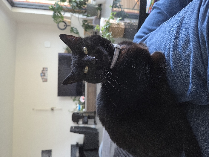 - "The image displays a black domestic cat with yellow-green eyes and a light-colored collar, positioned in the foreground" by FM-kNXPq2, licensed under CC BY 4.0