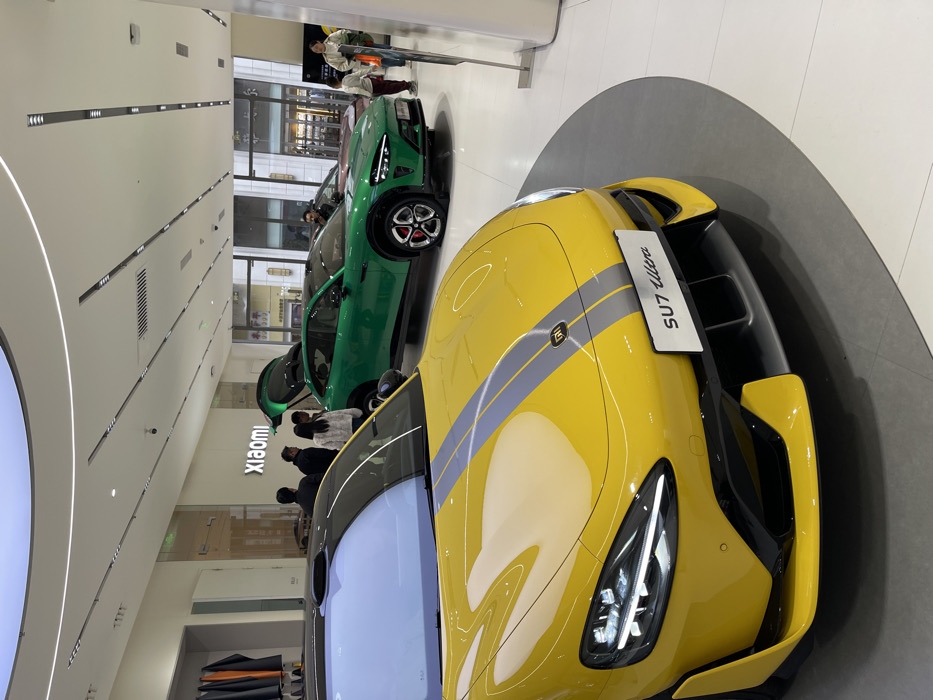 The image displays a modern automobile showroom, identified by a "Xiaomi" sign on a white wall in the background, located in the city of Zhongyuan District, China. In the foreground, a bright yellow "SU7 Ultra" car is prominently featured on a circular dark grey mat. This vehicle exhibits two parallel grey racing stripes on its hood and has illuminated LED headlights. To the right, further back, a vibrant green SUV with its rear hatch open is also on display. Approximately five individuals are present: a cluster of three to four people observe the area near the Xiaomi sign, while an adult and a child stand to the right, near the green SUV. The showroom features polished white floor tiles, a white ceiling with linear and circular recessed lighting, and large glass windows at the rear, revealing an urban exterior. A clothing rack is partially visible on the far left.