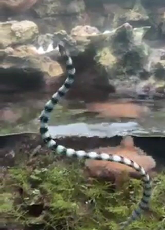 The video depicts a Banded Sea Krait, a venomous snake with black and white stripes, swimming in an aquarium
