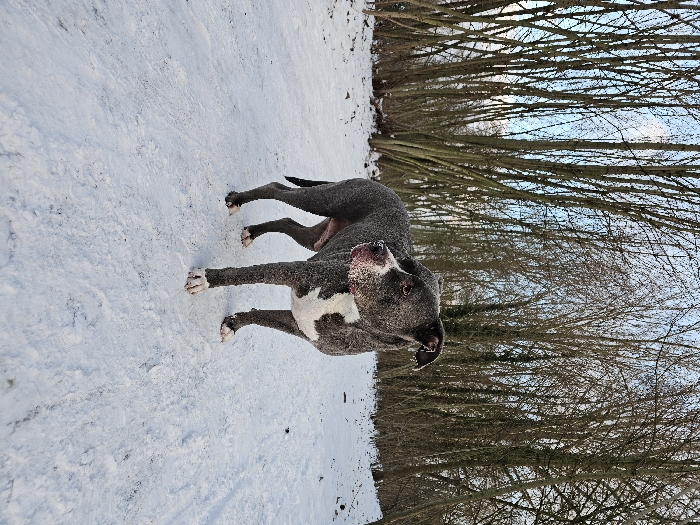 - "A grey and white dog, consistent with a Pitbull-type breed, stands on a snow-covered path in a wooded area in Schifflange, Luxembourg" by FM-n22Rc2, licensed under CC BY 4.0