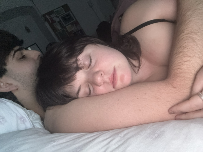 Two individuals are depicted in an intimate, low-light indoor setting, likely a bedroom. The specific location within Cortona, Italy, is not discernible from the image. In the foreground, a female individual with dark hair and bangs lies on her right side, eyes closed, appearing to be asleep. She wears a black bra, with a visible strap across her back. A silver-colored nose ring is present on her right nostril. Her right arm is extended forward, resting on white bedding. Behind her, a male individual's head is visible, positioned closely against the back of her head or neck, with his eyes also closed, suggesting he is also asleep or resting. He has dark, curly hair and visible facial stubble. A small earring is present in his left earlobe. His right arm, covered in dark hair, is wrapped around the female individual. A silver-colored ring is visible on the ring finger of his right hand. Both individuals are lying on white bedding, including a pillow partially visible beneath the male's head. In the dimly lit background, multiple framed items, possibly pictures or documents, are affixed to a wall.