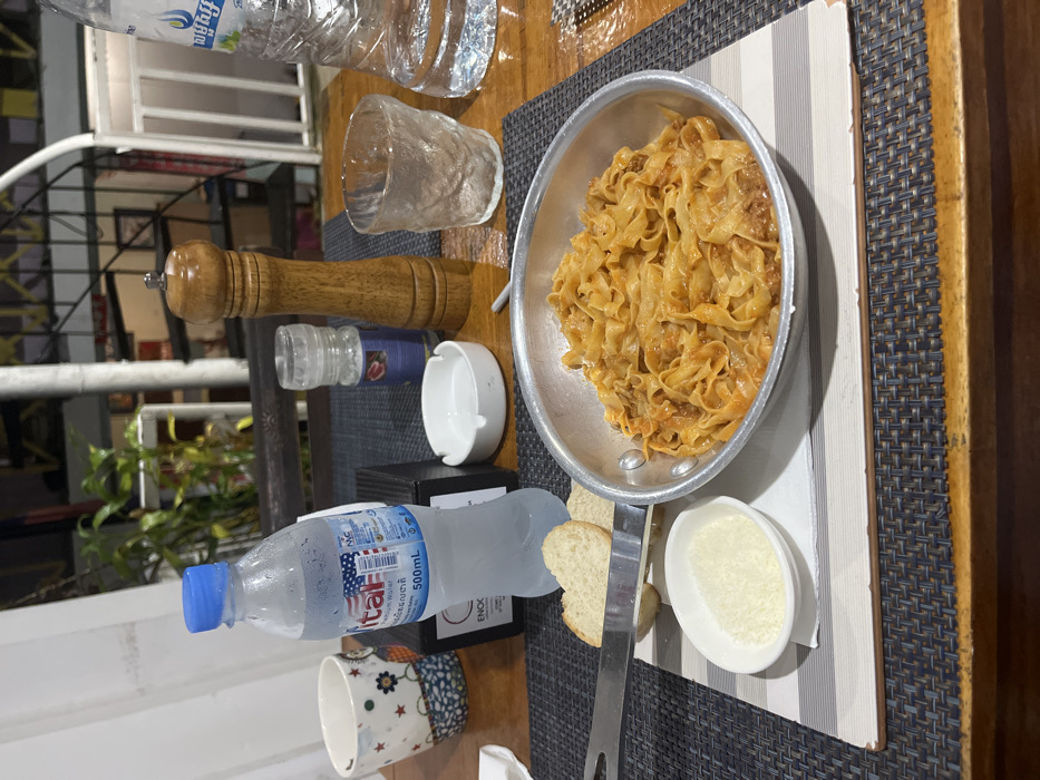 The scene depicts a dining table set for a meal at night in Koh Toch Village, Cambodia. A metal frying pan containing tagliatelle-style pasta with a reddish-brown sauce is positioned centrally. To its left, two slices of bread are on a small white rectangular plate, alongside a small white oval bowl filled with grated white cheese. Silver serving tongs rest on the bread plate. On the dark woven placemat, a 500ml frosted plastic bottle of Vital Premium Water stands beside a black napkin holder. A white ceramic ashtray, a clear plastic shaker (likely salt), a tall wooden pepper mill, a textured clear drinking glass, and a larger plastic bottle of Kul water are also present on the table. A decorative ceramic mug is partially visible on the far left. The wooden table surface is visible underneath the placemat and items. The background, dimly lit, shows a white spiral staircase with dark steps, blurred green foliage, and white building structures, indicative of an outdoor or semi-open restaurant setting. No people are visible in the frame.