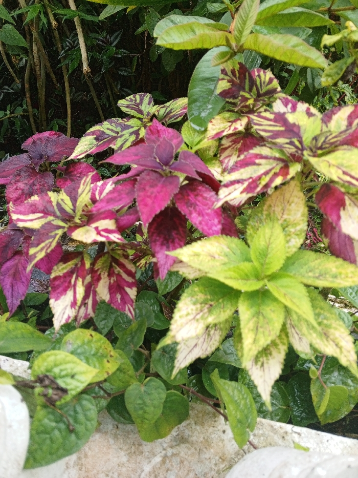 The image displays a close-up view of several plant species growing in Khe Sanh Commune, Vietnam. The central focus is on various types of foliage exhibiting distinct color patterns. Prominently featured are multiple clusters of Coleus-like leaves, characterized by deep magenta and dark red bases with irregular, stark yellow and cream-colored stripes or blotches. To the right and slightly lower, another plant presents light green leaves with subtle, mottled yellow-white variegation, arranged in a dense, radial pattern. In the upper left background, darker green foliage and slender, vertical stems are partially visible, indicating dense plant growth. The lower edge of the frame reveals a textured, light-colored surface, consistent with concrete or stone, suggesting the plants are contained within a planter or growing adjacent to a man-made structure. No people, animals, or discernible actions are present.