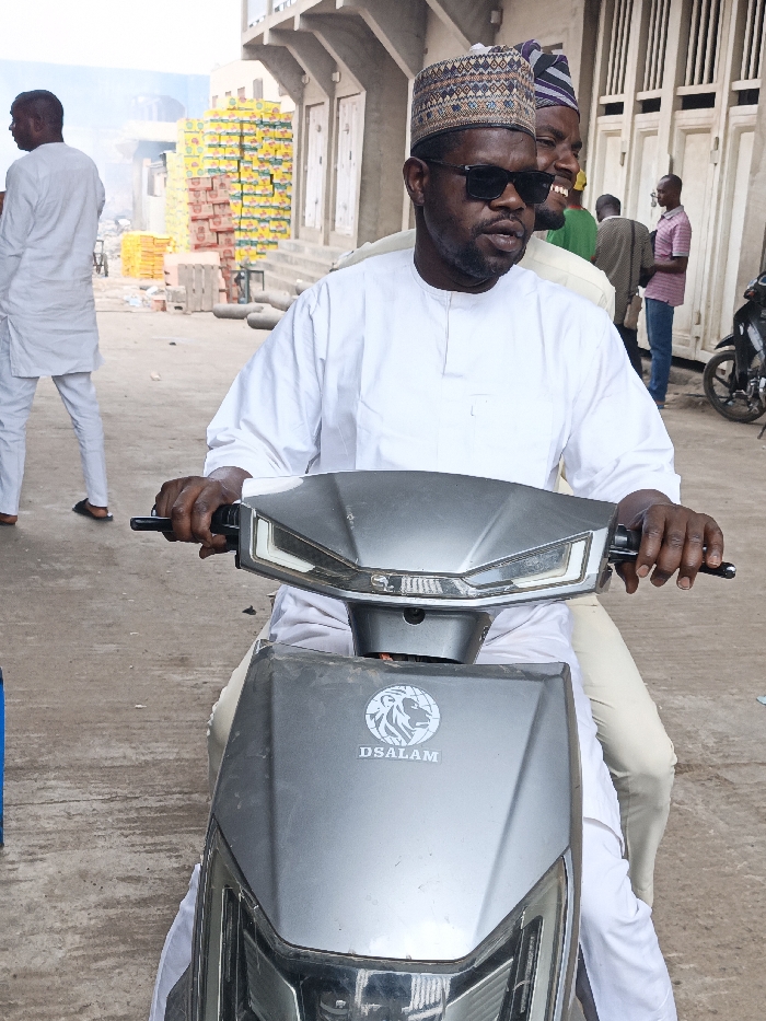 The scene is an outdoor street or market area in Fagge C, Nigeria, under bright daylight. In the immediate foreground, a dark-skinned male, estimated to be in his 30s or 40s, with a short beard, is seated on a gray motor scooter. He wears a white long-sleeved tunic (kaftan-style), black rectangular sunglasses, and a multicolored woven cap with geometric patterns. His hands are positioned on the scooter's handlebars. Directly behind the driver, a second dark-skinned male is seated, wearing a light-colored top and a blue and white striped cap, looking to his right with a slight smile. The gray scooter's front panel features a white circular logo depicting a lion's head inside a globe, with the text "DSALAM" below it. In the mid-ground to the left, a third male, also in a white tunic and white trousers, stands facing away from the camera. Behind him, tall stacks of yellow and red packaged goods, possibly on pallets, are visible. To the right, multiple other males are present in the background; one wears a green shirt, another a light-colored shirt and blue jeans. The background is dominated by unpainted or rendered concrete buildings with multiple doorways and visible steps leading upwards. A black motorcycle is partially visible on the far right. The ground surface is light-colored concrete or compacted earth.