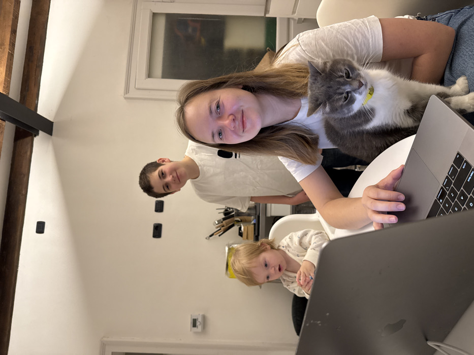 A woman, cat in arms, smiles at the camera while working on a laptop. A boy stands slightly behind her, also smiling. A young child sits in a high chair, focused on something in front of them, possibly another screen. The scene is indoors, likely at home, with visible beams and wall fixtures in the background. Another laptop is at the bottom of the image and is blocking the full view.
