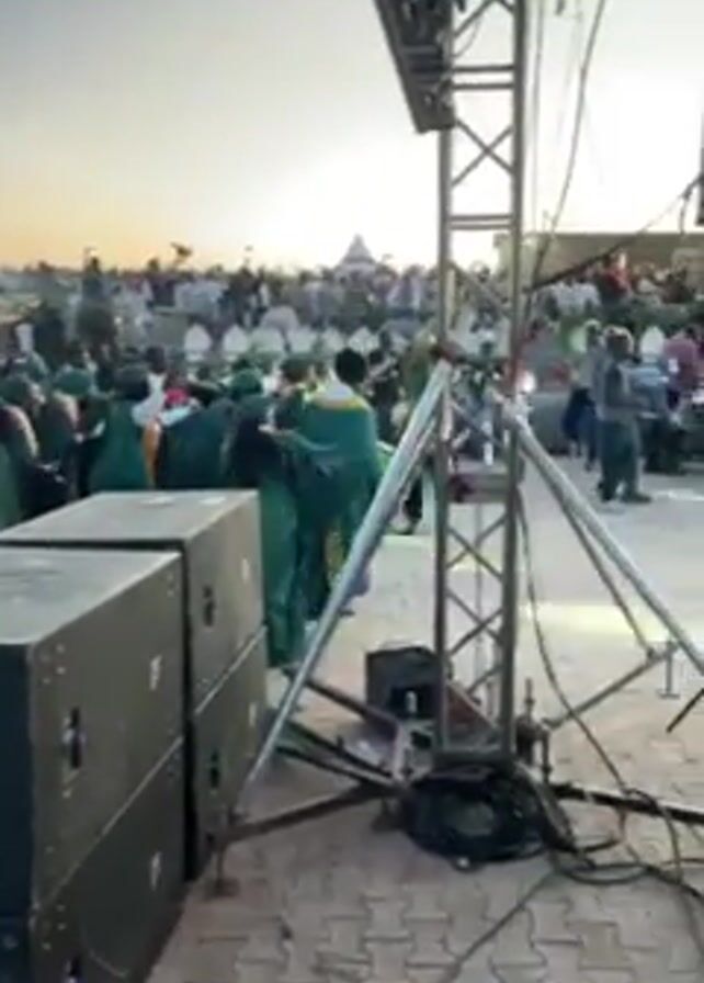 n outdoor event, possibly a graduation ceremony, from a side stage perspective. The scene is filled with people wearing green and yellow graduation gowns, seated in rows or standing in groups. In the foreground, there are large black speakers stacked on top of each other and a metal stage structure. The sky is a pale blue with the sun visible in the distance. The ground is paved with interlocking bricks. Some people are moving around, and the overall atmosphere appears celebratory.