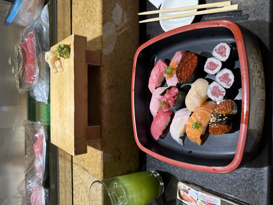 The scene depicts a meal served at a sushi restaurant counter in San Diego, California, United States of America