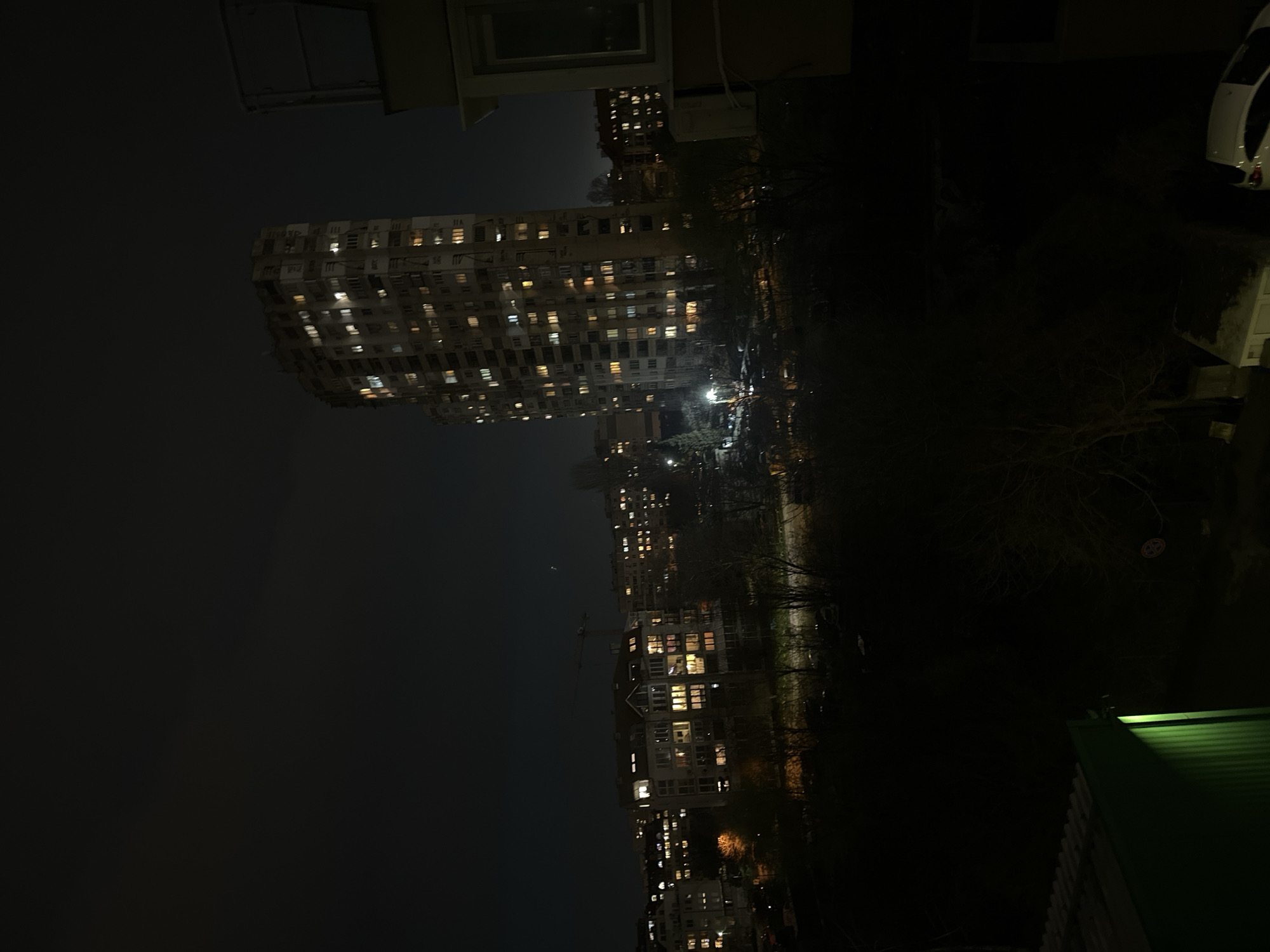 The image displays an urban night scene in Sofia, Bulgaria, viewed from an elevated perspective. A prominent, tall, multi-story residential building, appearing to be a concrete panel block, stands in the mid-ground on the right, with numerous windows illuminated on various floors. Several other residential buildings, also with illuminated windows, are visible across the mid-ground and background. A construction crane is faintly discernible in the distance behind the mid-ground buildings. The foreground features dark, bare deciduous trees and unkempt vegetation, suggesting a late autumn or winter season. A street or parking area is visible at the base of the tall building, illuminated by streetlights, with several vehicles parked. A white car is partially visible in the lower right. In the bottom left foreground, a section of a green, possibly corrugated metal, roof or structure is visible, illuminated by a green light source. The extreme right foreground shows part of a building's exterior wall, a window, and an outdoor air conditioning unit, indicating the vantage point is from an adjacent structure. The sky is dark and overcast. No individuals or active interactions are visible within the scene.