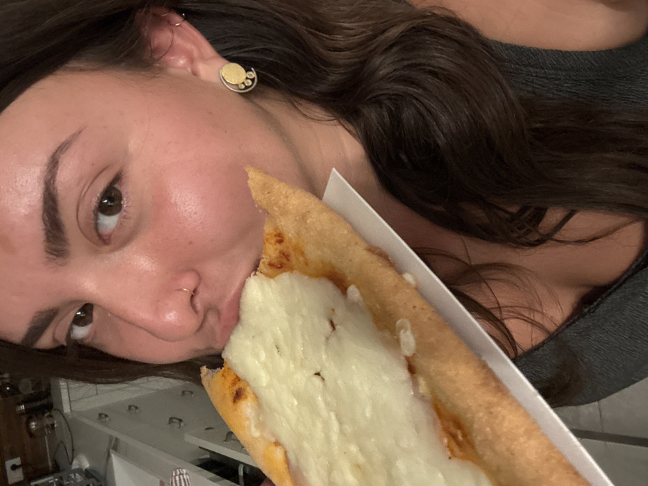 - "A female individual is depicted in a close-up, eye-level shot, positioned centrally, consuming a slice of pizza indoors" by FM-mfRp53, licensed under CC BY 4.0