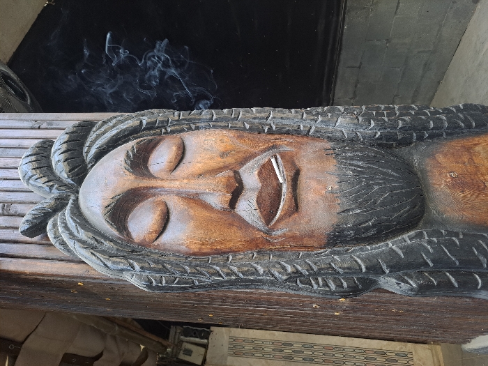 The image displays a weathered wooden carving of a human-like head and upper torso, positioned in an outdoor or semi-enclosed setting within the city of Unknown, Unknown