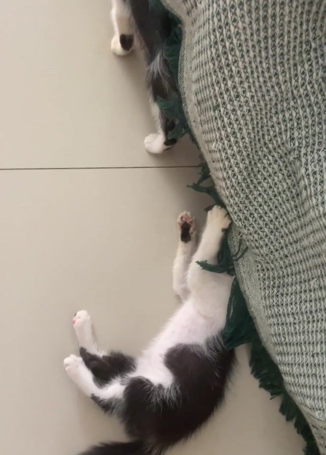 The camera, held at a high angle, shows two small black and white kittens playing near the edge of a couch or bed that has a green and white patterned blanket draped over it. The kittens are on a tiled floor with grout lines visible. One kitten is lying on its back batting at the fringe of the blanket, while the other kitten is standing and sniffing or pawing at the blanket's edge. The feet of the person holding the camera are visible in the lower part of the frame. The room is brightly lit.