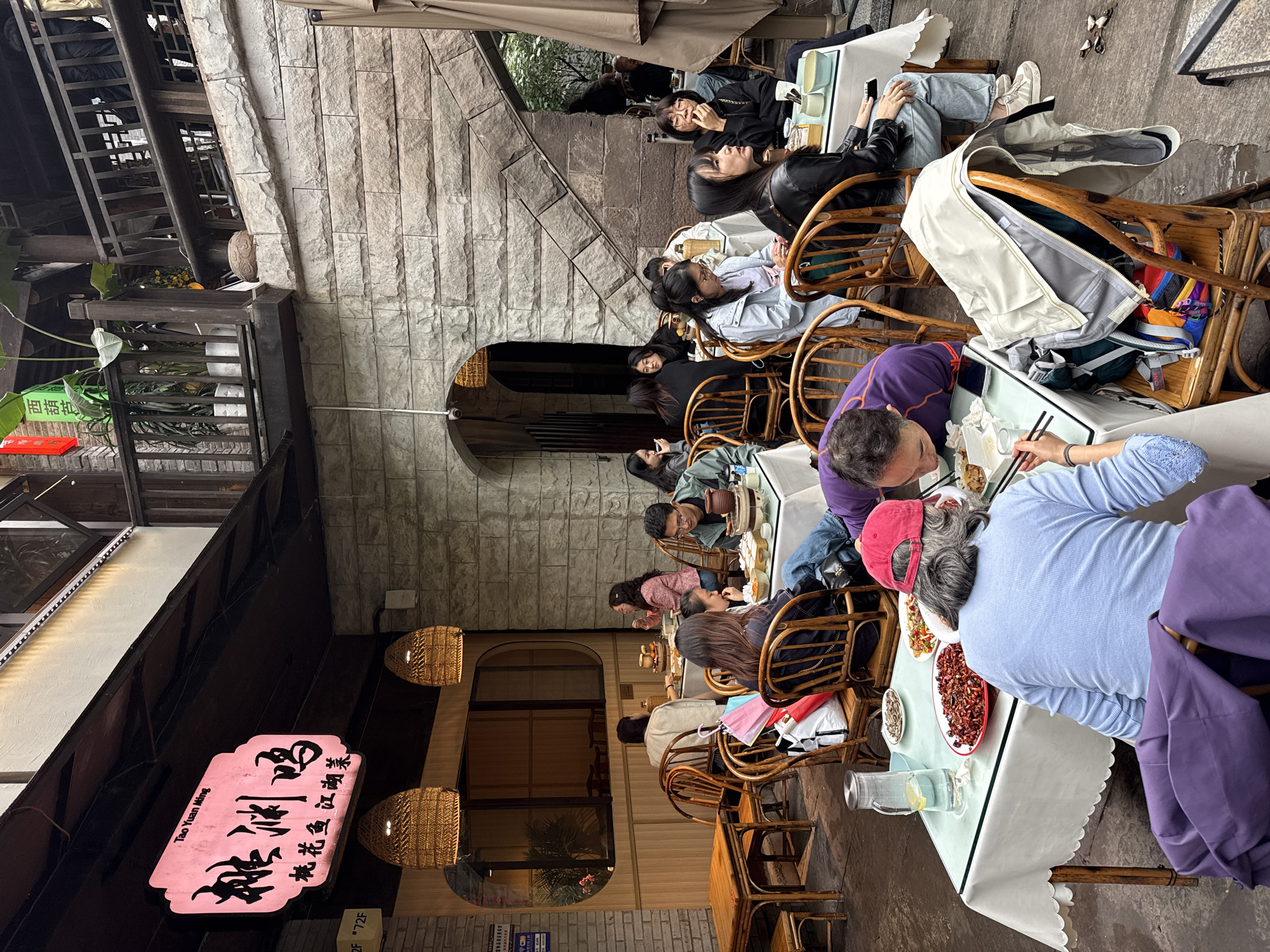 - "The image depicts an outdoor dining area of a restaurant, identified by a pink neon sign as "Tao Yuan Ming" (桃花涧鸭) and "桃花鱼江湖菜", located in Nan'an District, China" by FM-jql2J3, licensed under CC BY 4.0