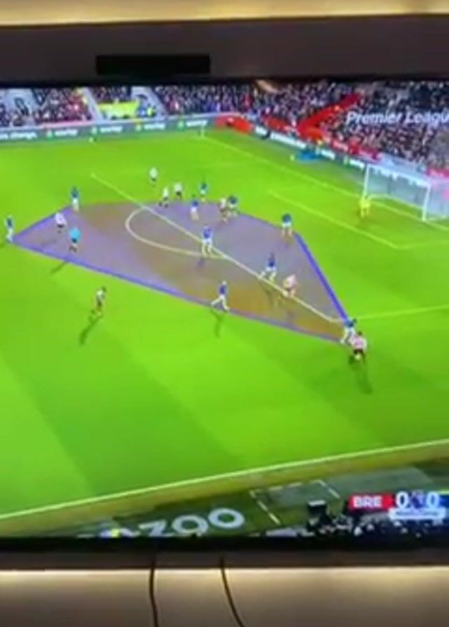 TV screen with a soccer game on it. The game is in progress and shows a purple, transparent polygon highlighting the players. The players are wearing blue and red jerseys, and the ball is in the center of the polygon. Numbers are placed on the screen to number the players within the polygon. The game is paused. The score at the bottom of the screen is BRE 0-0. The words "Premier League" are on the TV screen at the top right.