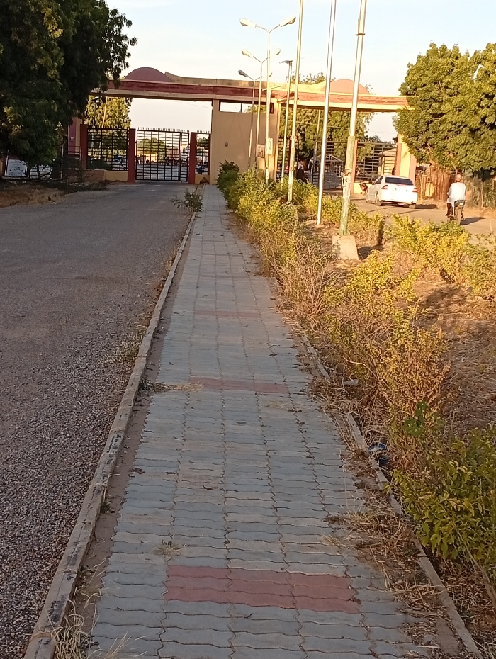 A brick walkway stretches into the distance, flanked by low-lying vegetation. Beyond the walkway, a gated entrance leads to a building complex. Tall light posts rise along the walkway, casting shadows in the sunlight. A white car and a person on a bicycle are visible inside the complex. The sky is pale blue, suggesting early morning or late afternoon. A gravel area borders the walkway on the left. Trees are visible on either side of the scene.