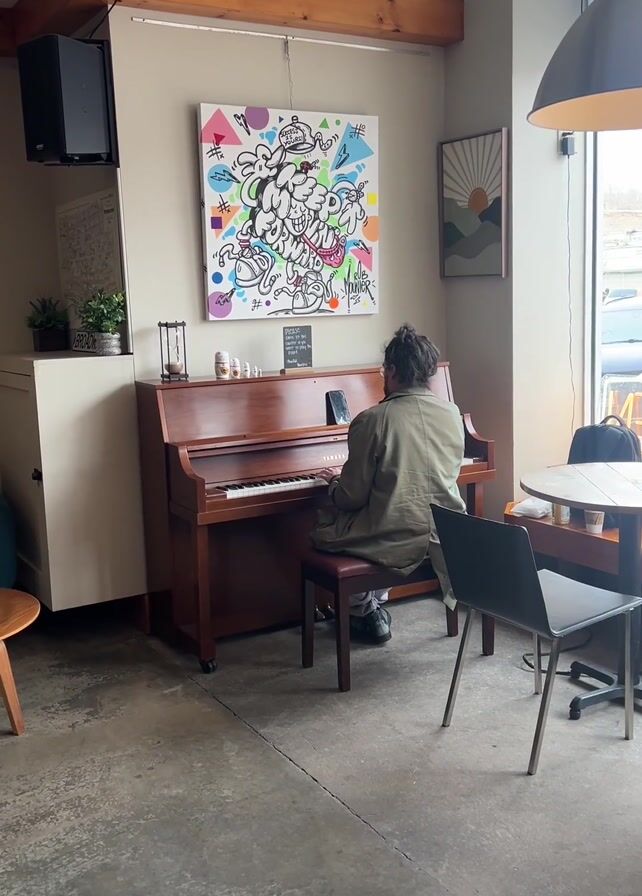 man playing an upright Yamaha piano in a room with neutral-colored walls. The man is seen from behind, wearing a green jacket and seated on a piano bench. Above the piano hangs a colorful square painting with abstract figures and lettering. A small sign sits atop the piano, and a cell phone is visible next to it. The room has a concrete floor and is furnished with a gray chair and a small round table by a window. A hanging lamp provides light. There is also a cabinet, a hanging speaker and a framed print on the walls.