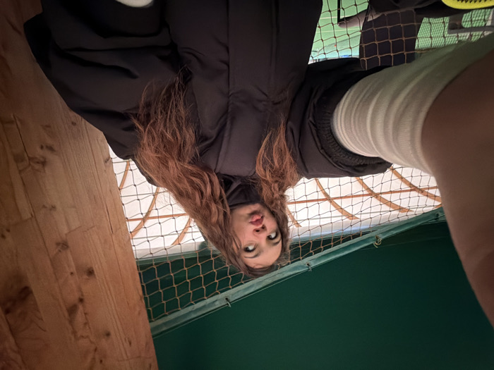 An indoor scene in Souffelweyersheim, France, captured in a selfie features a young female individual. She is positioned centrally, gazing upwards and to the right with pursed lips. Her long, wavy, reddish-brown hair flows over her shoulders. She wears a dark, possibly black, puffer jacket, and a light-colored, ribbed long-sleeved shirt is visible on her left arm, extended forward, holding the camera. The background reveals elements of an indoor sports facility: a dark green overhead structure, a white square-mesh net stretching horizontally, and behind it, a lighter ceiling with curved wooden architectural supports. A large, light-colored wooden pillar constructed from planks dominates the right side of the frame. A green artificial turf surface is visible in the lower left, with a small yellow object partially discernible in the bottom left corner.
