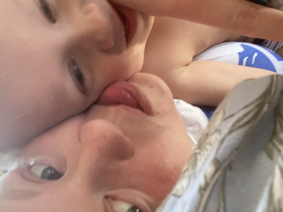 An overhead, close-up image depicts two individuals in Malaya Purga, Russia: an adult on the left and a child on the right, engaged in close physical interaction. The adult, with light skin and an upward gaze, extends a pink tongue to touch the right cheek of the child. The child, also with light skin, has partially visible eyes looking downwards and a slight smile. The child's upper torso and arm appear bare, with a blue and white inflatable object partially visible beneath them. A patterned fabric, light blue with a brown leaf motif, is visible in the lower left foreground.