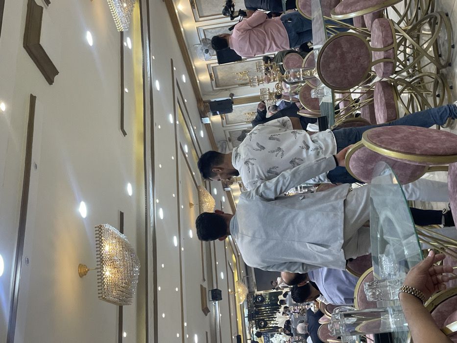 The image depicts an indoor event space within the city of Babella, Syria, characterized by ornate decor