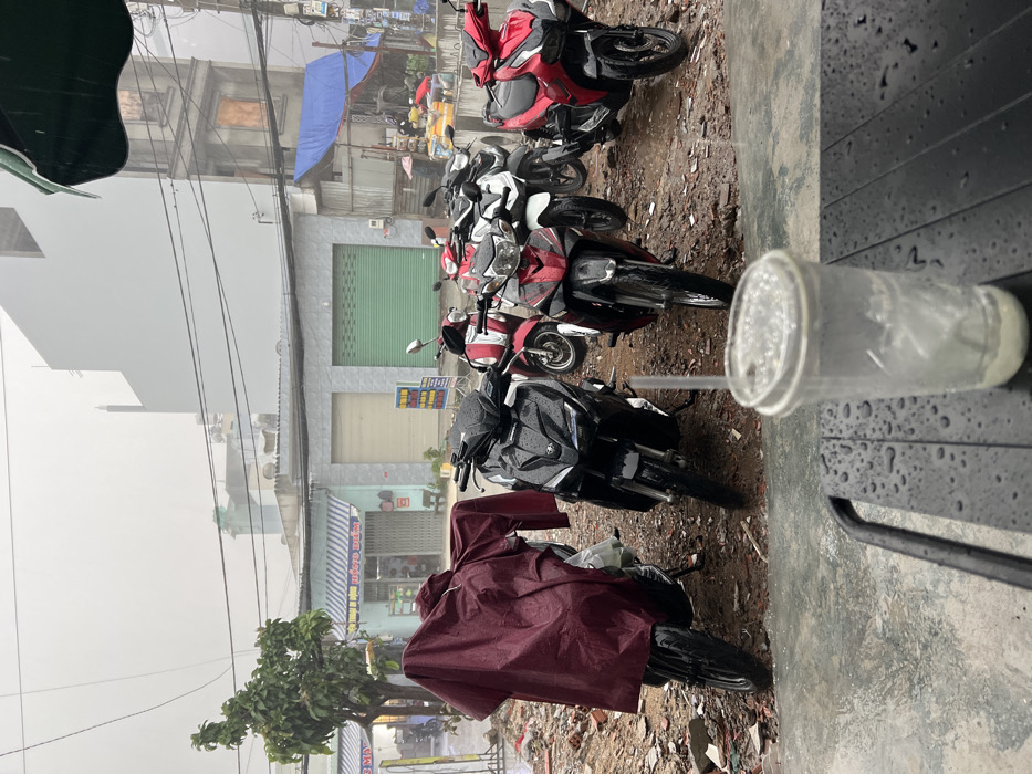A row of motorbikes parked on a wet street on a cloudy day. The motorbikes are different colors including red, black, and white. A clear glass with condensation sits on a nearby surface. A red poncho covers one of the motorbikes. The street is littered with debris. Buildings are visible in the background.