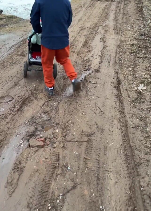 A person wearing a dark blue hooded jacket, orange pants, and dark shoes is pushing a stroller down a muddy road. The stroller appears to have a child inside, covered by a green blanket, with a red object visible at the top. Patches of snow are visible on either side of the road. The road is heavily marked with tire tracks and puddles. The camera then pans down to show the legs of a person wearing orange pants and white sneakers walking along the same muddy road, carrying a pink plastic bag. Houses are visible in the background.