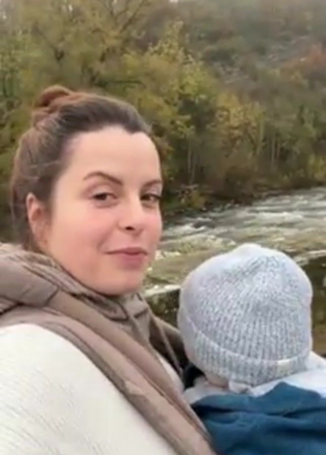 A woman holding a baby is standing on a bridge in front of a river. The woman is wearing a white sweater, a tan scarf, and her hair is in a bun. The baby is wearing a blue jacket and a gray knit hat. The river is flowing quickly and the banks are lined with trees. The weather appears to be overcast. The woman turns her head to look at the camera and then back at the river.