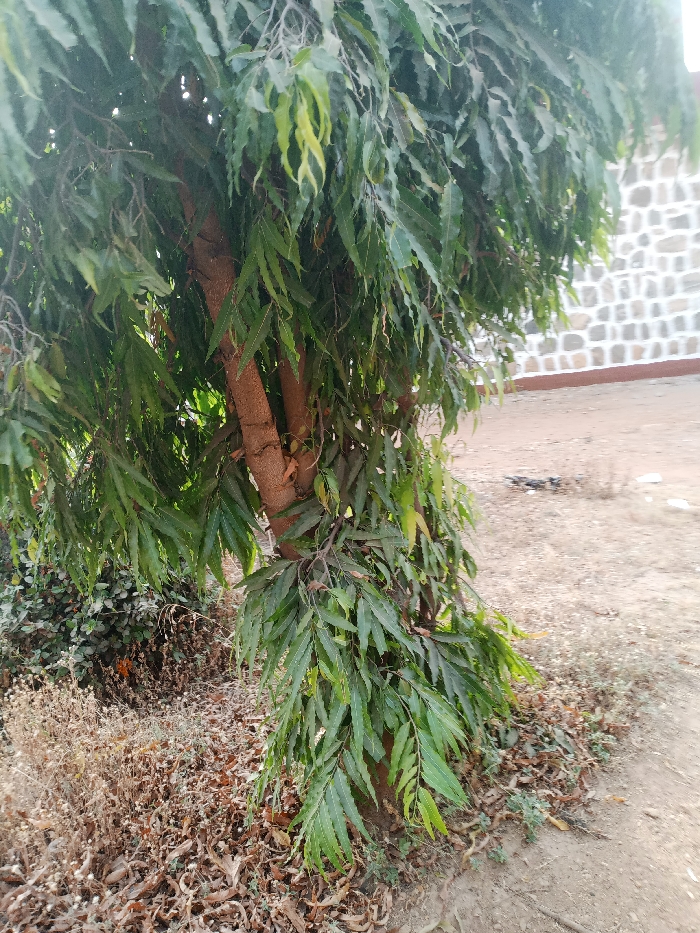 A tree with slender, drooping green leaves dominates the frame. Its reddish-brown trunk divides into several stems. The ground around the tree is covered in dry leaves and brown vegetation. In the background, a stone wall with a painted border is visible. A patch of bare earth and a hint of sky complete the scene.